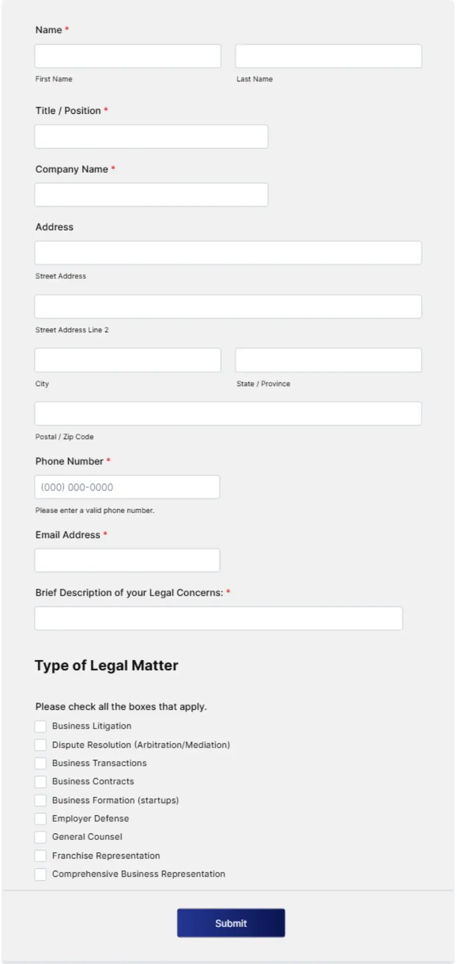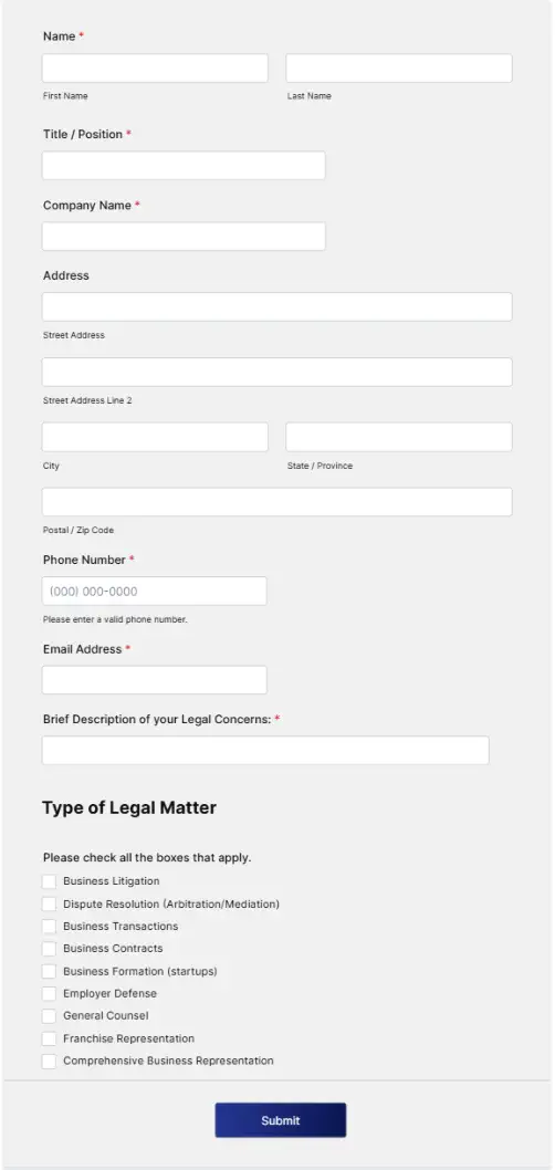 What Happens Next?Our Review Process1. Prompt ResponseWe'll review your case evaluation form during business days and contact you to schedule your consultation.2. Consultation SchedulingOur team will coordinate a convenient time for your free initial consultation.3. Document ReviewIf you have relevant documents, we'll ask for these to be collected.4. Strategic DiscussionDuring your consultation, we'll discuss potential strategies, timelines, and next steps specific to your situation.Confidentiality NoticeAll information provided in this case evaluation form is protected by attorney-client privilege and will remain strictly confidential. Submitting this form does not create an attorney-client relationship, which is established only through a signed engagement agreement.Privacy Policy NoticeBy submitting this form, you acknowledge that you have read and agreed to our privacy policy regarding the collection and use of your information. We will not share your information with third parties and use it solely for the purpose of evaluating your legal needs and providing legal services.